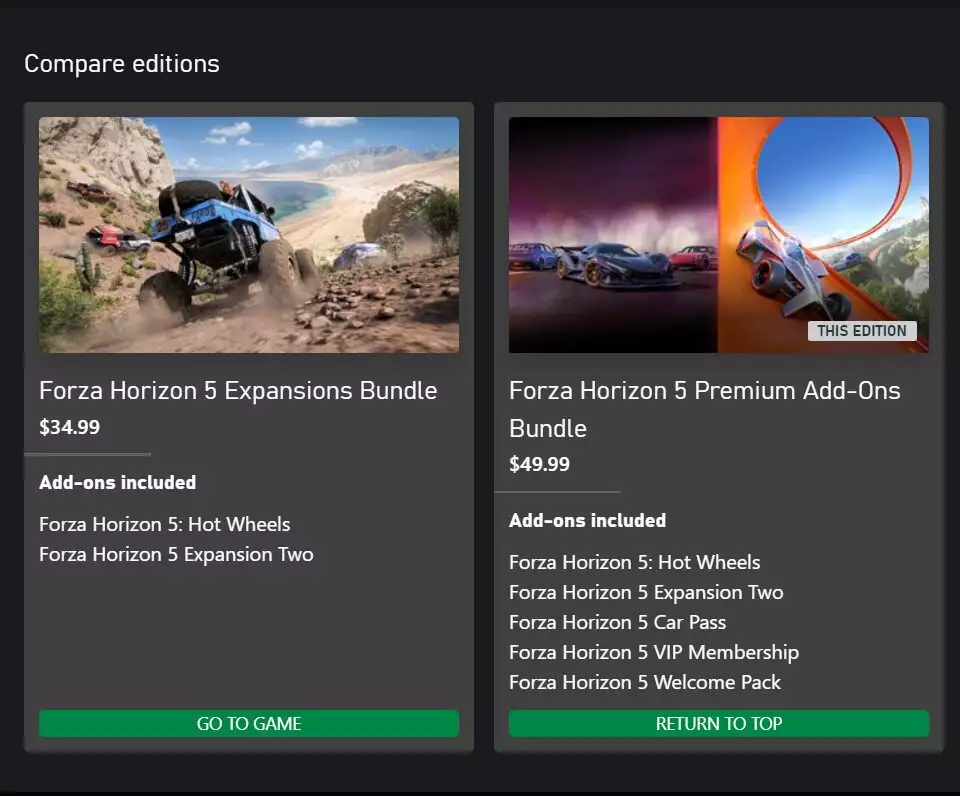 Die zweite Option ist das Forza Horizon 5 Premium-Add-on-Bundle, das nicht nur alle im Forza Horizon 5-Erweiterungs-Bundle erwähnten Inhalte enthält, sondern auch die Add-on-Inhalte VIP-Mitgliedschaft, Willkommenspaket und Autopass. Dieses Paket kostet 49,99 $/39,99 £, da beide Erweiterungspakete das Basisspiel erfordern, damit die Inhalte im Spiel verfügbar sind.